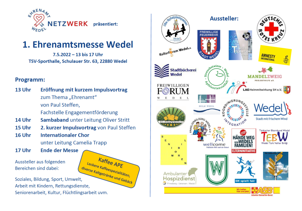 Die erste Wedeler Ehrenamtsmesse fand am Samstag, 07. Mai 2022 von 13-17 Uhr statt. Trotz eyecatcher vor der dem Eingang der Wedeler TSV-Sporthalle (Schulauer Straße 63) mit Feuerwehr und DLRG war die Messe leider nicht sehr gut frequentiert.
